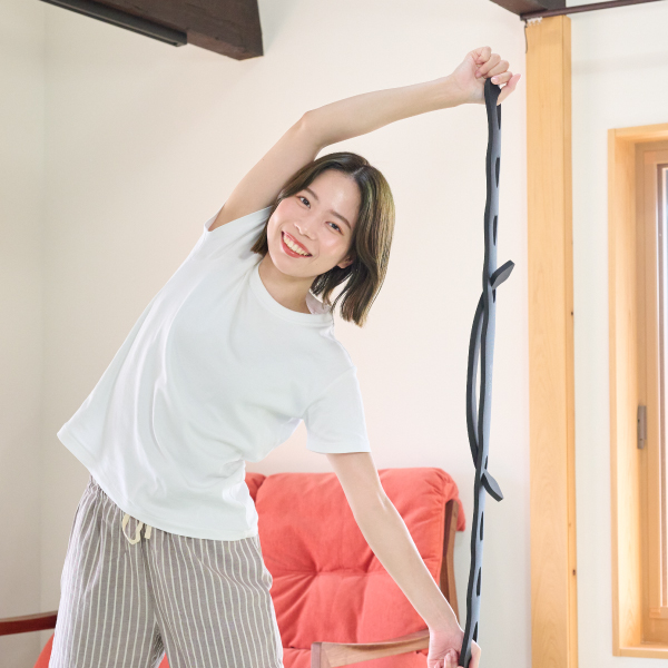 2.傾ける側のバンドを少し強めに引っ張りながら身体を横に傾けます。(左側に身体を倒す場合は左手でバンドを少し強めに引っ張ります)