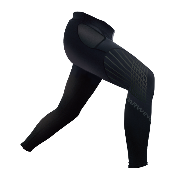 大腿前面を二層構造にすることで、表層生地のバネのような張力が脚を前方に振り出す動作をサポート。
