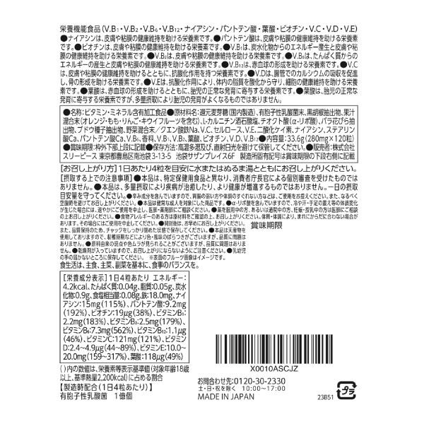 還元麦芽糖(国内製造)、有胞子性乳酸菌末、黒胡椒抽出物、果汁混合末(オレンジ・もも・りんご・キウイフルーツを含む)、L-カルニチン酒石酸塩、チオクト酸(α-リポ酸)、バラ花びら抽出物、ブドウ種子抽出物、野菜混合末/クエン酸鉄Na、V.C、セルロース、V.E、二酸化ケイ素、ナイアシン、ステアリン酸Ca、パントテン酸Ca、V.B6、HPC、V.B1、V.B2、シェラック、葉酸、香料、ビオチン、甘味料(スクラロース)、V.D、V.B12