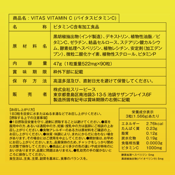 黒胡椒抽出物(インド製造)、デキストリン、植物性油脂/ビタミンC、ゼラチン、結晶セルロース、ステアリン酸カルシウム、酵素処理ヘスペリジン、植物レシチン、安定剤(加工デンプン)、微粒二酸化ケイ素、植物性ステロール、ビタミンP