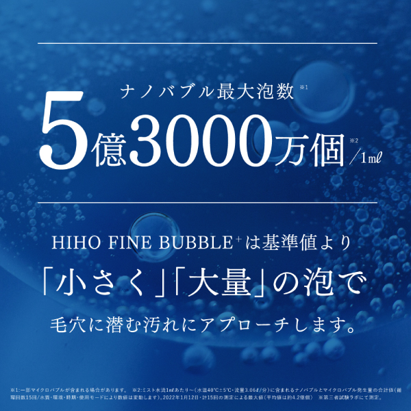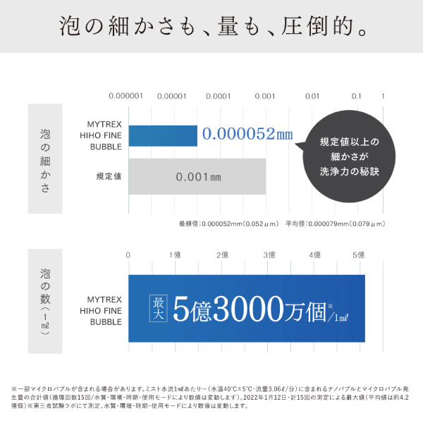 ※ミスト水流1mlあたり(水温40℃±5℃・流量3.06L/分)に含まれるナノバブルとマイクロバブル発生量の合計値(循環回数15回/水質・環境・時期・使用モードにより数値は変動します)。2022年1月12日・計15回の測定による最大値(平均値は約4.2億個)※第三者試験ラボにて測定。水質・環境・時期・使用モードにより数値は変動します。※2:全身についた汚れをシャワーでくまなく洗い流すこと。