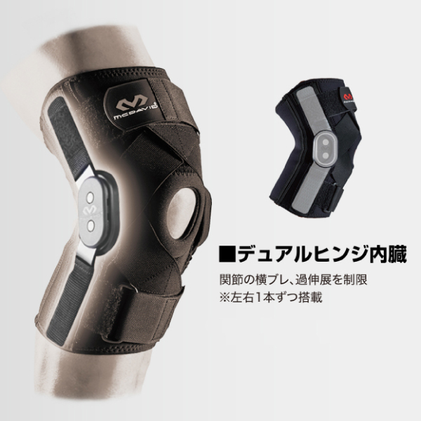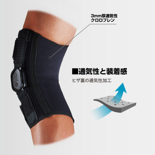 ヒザの曲げ伸ばしは妨げにくく、関節の横ブレや過進展をサポート(左右1本ずつ搭載)