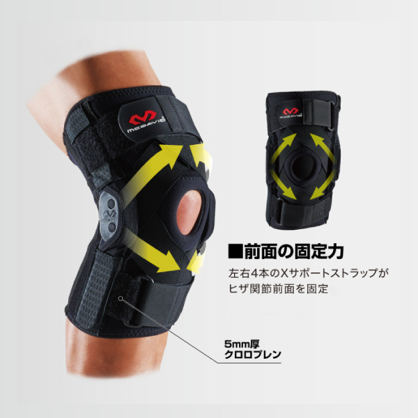 左右4本のXサポートストラップがヒザ関節前面の固定力をアシストし、不安定感を軽減
