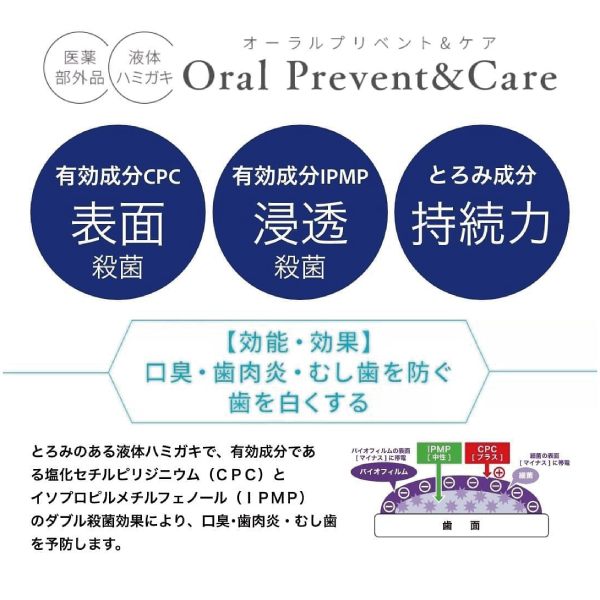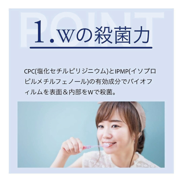 ・有効成分である塩化セチルピリジニウム(CPC)とイソプロピルメチルフェノール(IPMP)のダブル殺菌効果により、口臭・歯肉炎・むし歯を予防し、歯を白くします(※)