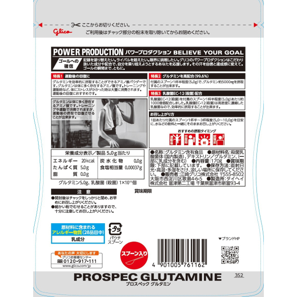 エネルギー 20kcal、たんぱく質 5.0g、脂質 0.0g、炭水化物 0.0g、食塩相当量 0.00037g/ グルタミン 5.0g、乳酸菌(殺菌) 1×1011個