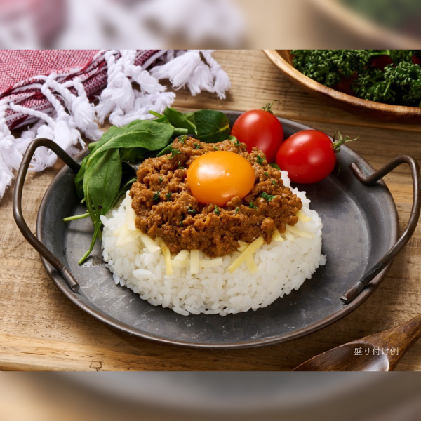 鶏肉(国産)、ソテーオニオン、マンゴチャツネ、粒状大豆たんぱく、バナナ、コラーゲンペプチド、リンゴ、乳たんぱく、えんどうたんぱく、人参、コーンスターチ、菜種油、小麦粉、トマトケチャップ、鶏出汁、香辛料、ココナッツミルク、醤油、食塩、乳等を主要原料とする食品、にんにく、バター、しょうが、アーモンドプードル/カラメル色素、クエン酸、乳化剤、メタリン酸Na、安定剤(増粘多糖類)、カロチン色素、(一部に小麦・乳成分・アーモンド・大豆・鶏肉・バナナ・リンゴ・ゼラチンを含む)
