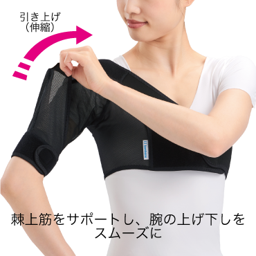 ・伸縮する引き上げベルトが負担のかかりやすい棘上筋の収縮を補助し、腕の上げ下ろしをスムーズに